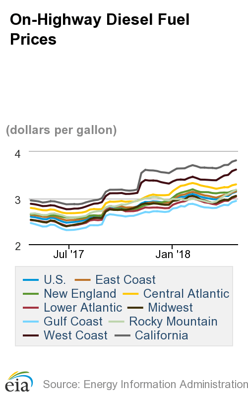 Average diesel prices have increased more than 18 cents in the past six weeks. Source: EIA