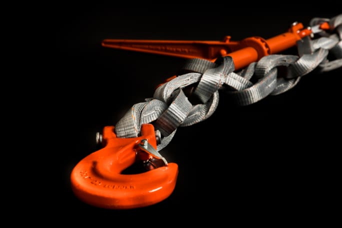 The DoNova textile chain, which can be used as a traditional lashing or lifting chain, is a multilayered redundant system which is abrasion and cut-resistant. When used as a lashing chain, the DoNova PowerLash is as powerful as a 13mm grade 80 steel chain, with a lashing working load limit of 22,000 pounds.
