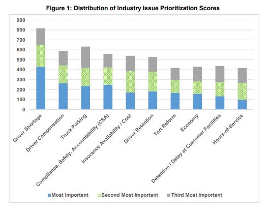 The shortage of drivers remains the most pressing issue affecting the trucking industry, according to the American Transportation Research Institute’s annual survey. Driver compensation and retention, parking shortage and soaring insurance premiums are among other key issues cited by ATRI’s 16th Top Industry Issuesreport.
