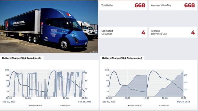 The Tesla Semis at PepsiCo’s Sacramento beverages depot have completed 384 miles on a single charge and 806 miles in a single 24-hour day, enabled by fast 750-kW charging.