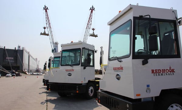 The heavy-duty zero emission battery electric yard tractors are being used to move cargo containers at the Red Hook Marine Terminal in Port Newark.