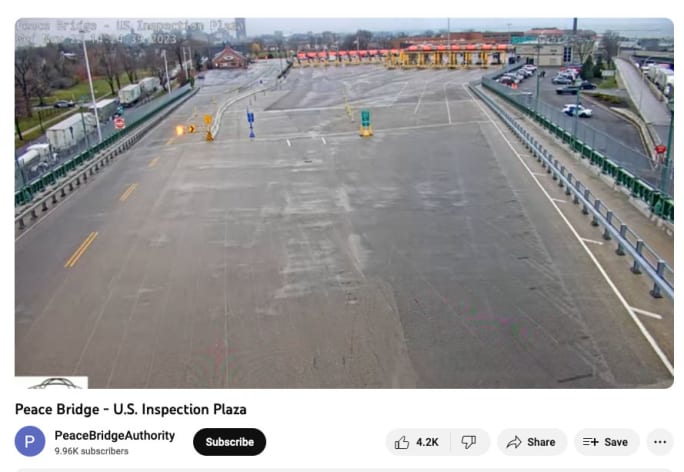 The website for the Peace Bridge was experiencing connection problems, including for wait times, likely due to increased amount of web traffic. However, web cams on YouTube showed the bridge and inspection area eerily empty.