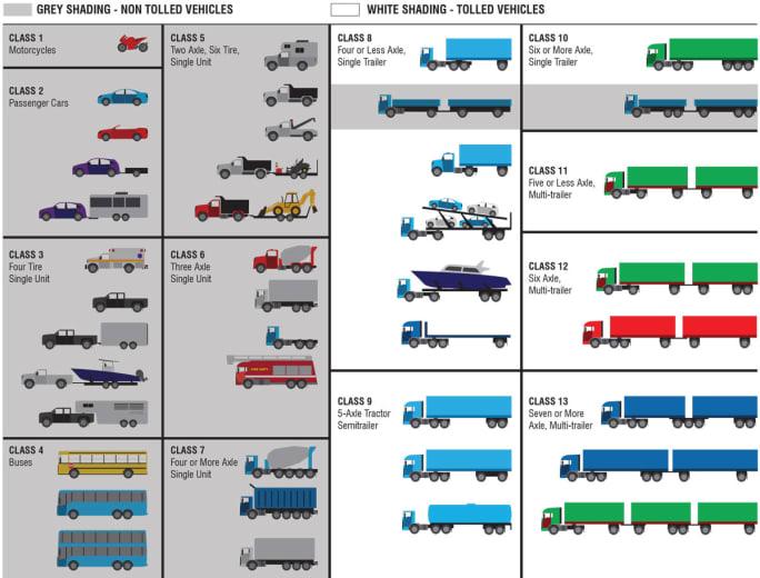This diagram shows the vehicles tolled and exempt under Rhode Island's truck tolls.