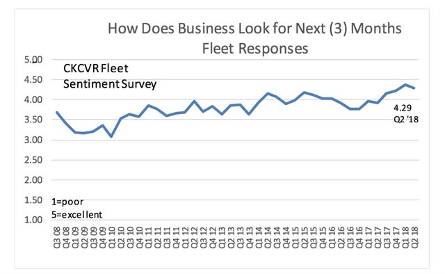 In addition, CKCVR’s “How’s Business” rating reflects the positive outlook for carriers. The survey asks, “Considering all the factors that impact your company, on a scale of 1-5 (with being poor and 5 being excellent) in your opinion, what is the overall outlook for your fleet in the next three months?” After setting a record during the January survey, the reading fell a bit in Q2, but still remains at a high 4.29 on a scale of 1-5.
