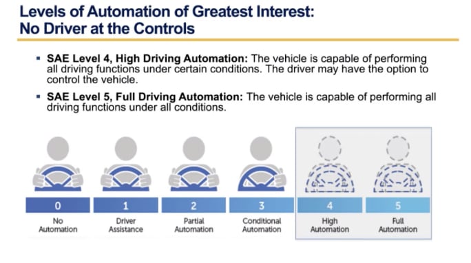 The office is focused on Level 4 and Level 5 autonomy as defined by the Society of Automotive Engineers, he explained, “only at those levels where the [automated driving system] controls all aspects of the driving tasks without intervention of a human driver. We primarily believe that Level 3 relies on the human for intervention, and that person would be considered the ‘driver,’ still subject to current driver regulations.”