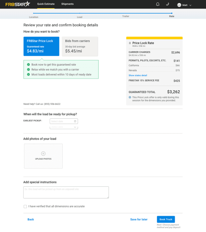 The Price Lock feature allows shippers to enter their open deck freight details, agree on a price that includes necessary permits, pilot cars, and a standard service fee and then FR8Star matches and books a qualified carrier.