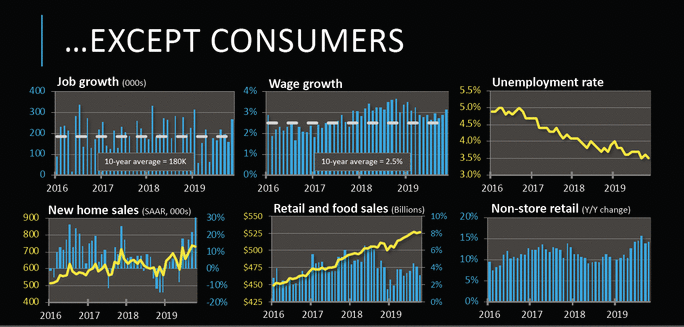 He shared graphs showing industrial production, manufacturing, construction, and durable goods orders for 2019 at flat or worse. However, job growth, wage growth, new home sales, retail and food sales, and non-store retail (e-commerce) continued to show growth, while unemployment remains near historic lows.