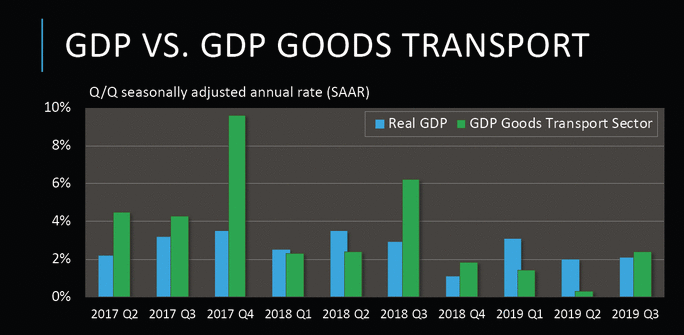 “The GDP Goods Transport Sector outpaced GDP for all of 2017 and '18. This year, however, the first two quarters the opposite was true, with it rebounding somewhat in the third quarter to be about on par with GDP." Trade issues have been distorting these numbers for more than a year, he said.
