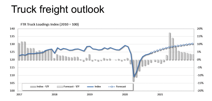 The huge increases in freight volume since the economic contraction are slowing, but the trucking industry still looks to see a strong 2021 in terms of both demand and rates. That was the message from FTR Transportation Intelligence in a virtual session Dec. 10 outlining the firm's outlook for 2021 in freight and commercial vehicles.