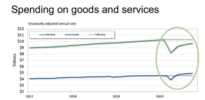 Freight volume surged in the third quarter for various reasons related to the pandemic, FTR’s analysts noted in the virtual session. Consumers benefitted from several trillion dollars in government financial support and stimulus, but they spent a greater share of that money on goods than on services because the pandemic limited spending on services such as travel and outside entertainment. Due to high unemployment and other factors, consumers still are not spending quite as much money as they were in February, but spending on services is down nearly 6% while spending on goods is up nearly 8%, benefiting trucking.