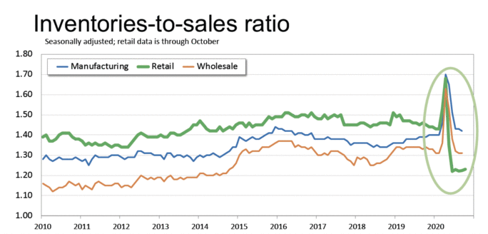 Retail inventories are still about 7% below the level in February, but what this means for 2021 is unclear. The fact that inventories are still low implies that a weaking of sales alone would not end the push to replenish inventories, said Vise. Starks agreed. “With the inventories situation still being constrained, that means it probably has some additional legs that we typically would not see,” Starks said.