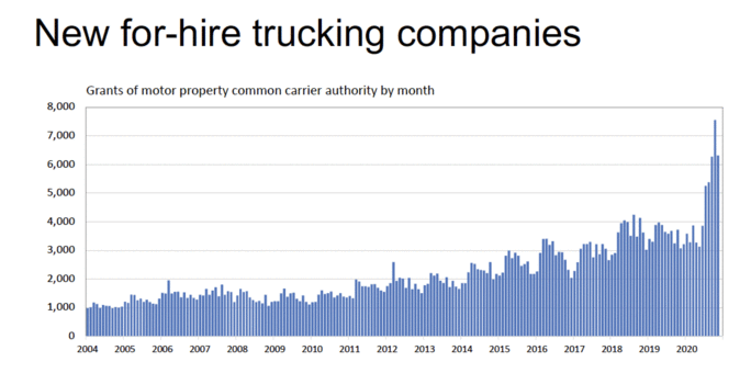 Another dynamic to watch in 2021 is what impact, if any, the unprecedented surge in newly authorized carriers since June will have on the freight markets, Vise said. The effect on overall capacity is unclear, he explained, because we do not know to what extent these new carriers are adding to capacity or just shifting from capacity leased to carriers to capacity operating under its own authority.