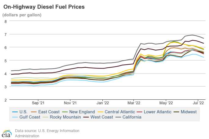 On-highway diesel fuel prices averaged $5.568 nationally as of July 11, according to figures from the Department of Energy, down 10.7 cents from the previous week, although up $2.23 from a year ago.