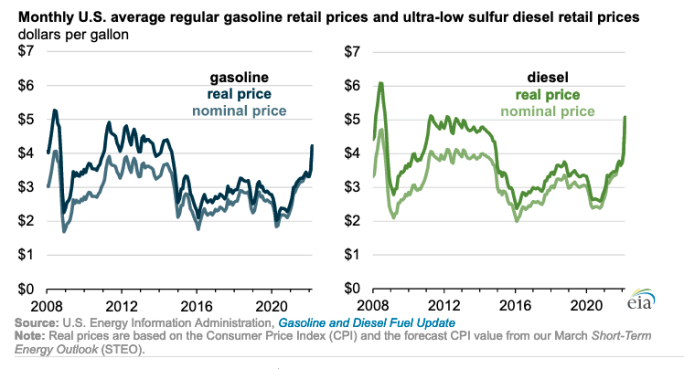 The DOE points out that when adjusted for inflation, prices are still lower than all-time highs in 2008. However, retail fuel prices have never increased so quickly on a percentage basis over a three-week period in the agency’s data, which for gasoline dates back to August 1990 and for diesel dates back to March 1994.