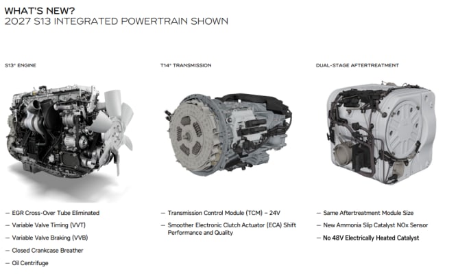 This slide shared with reporters by International illustrates the changes being made to the S13 Integrated Powertrain to meet EPA 2027 emissions regulations.