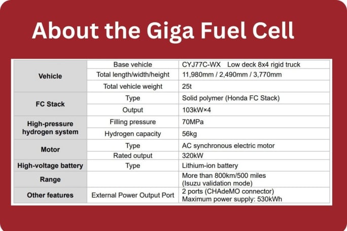 The Giga Fuel Cell is an Isuzu heavy-duty truck that has been reconfigured to be powered by a fuel cell system developed by both Isuzu and Honda.