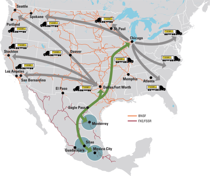 J.B. Hunt and BNSF Railway continue to expand their intermodal collaboration, teaming up with Mexican rail provider GMXT (GrupoMexico Transportes, perhaps better known by subsidiary name Ferromex) to provide fast service between Mexico and the U.S.