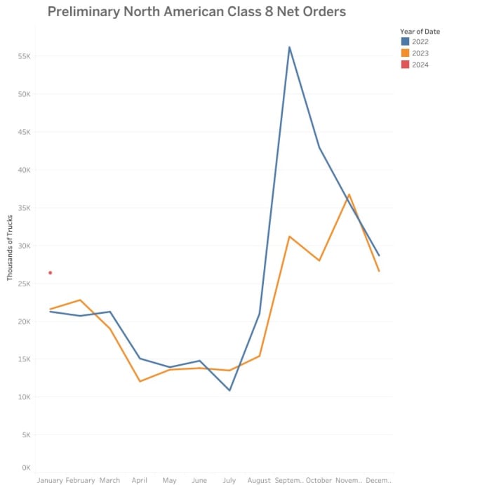 FTR reported preliminary Class 8 net orders increased in January by 2% over December 2023, but overall are much higher than a year ago.