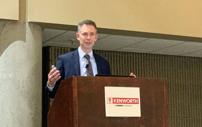 Kenworth GM Kevin Baney speaks to reporters at the North American Commercial Vehicle Show.