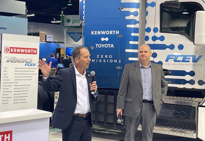 Joe Adams, Kenworth chief engineer (left) and Chris Rovik, executive program manager, advanced mobility, Toyota, discuss the companies’ heavy truck fuel-cell development partnership.
