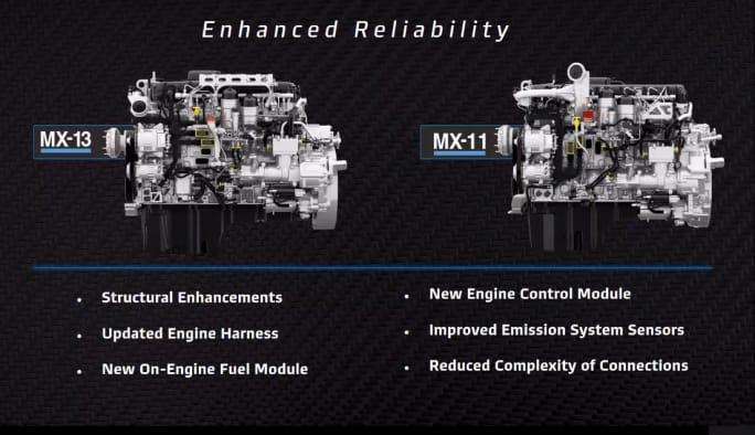 On the MX-13, there’s a new 485 hp rating with 1,650 lb.-ft @ 900 rpm, which is a lower rpm than previously available. In addition, there’s a new multi-torque rating, 405 hp, 1,650/1,750 at 900 rpm.