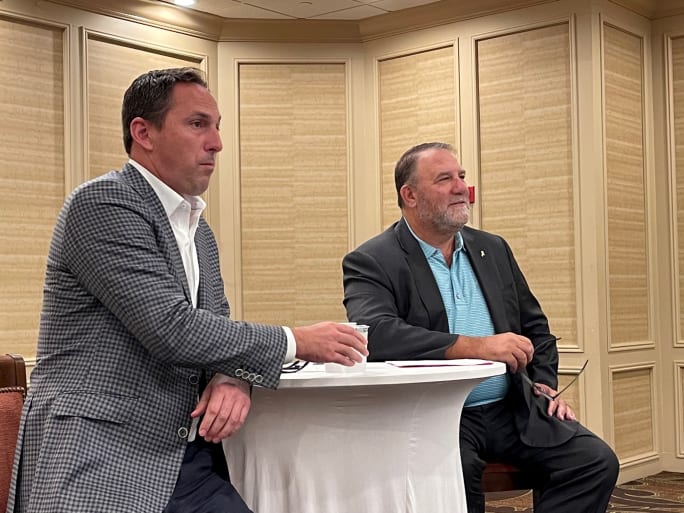 David Kriete and Johnathan Randall discuss Kriete Truck Centers expansion plans and sales of Mack electric trucks in Wisconsin at a press briefing on Sept. 26. 2023.