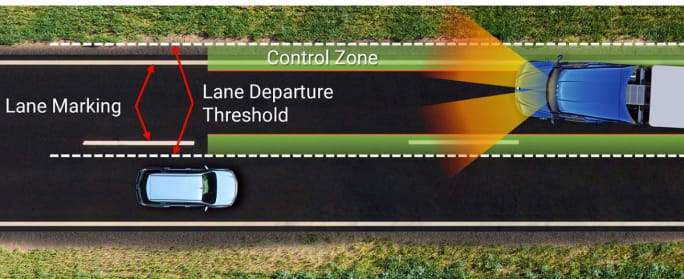 Lane Keeping Assist uses camera input to identify when the truck is departing the lane and provides a “nudge” to help keep the truck centered in the lane.