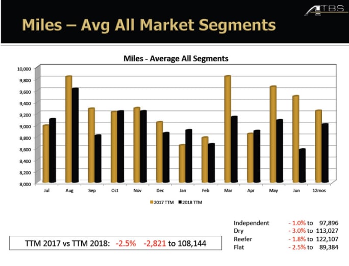 “Drivers often judge their success by miles,” he said. “The crazy thing is miles actually go down in a good economic cycle.” Showing a graph with miles down 2.5% overall to 108,144 and 2.5% down in flatbed to 89,000, he explained, “People might think it is because of ELDs, and for sure that’s probably a piece of it,” he said. The average owner-operator 15 years ago ran 133,000 miles a year, he said. “You can’t physically legally do that. So ELDs have affected that.” But it goes beyond that, he said. “To me, a driver has to earn a certain amount per week. What they really want is some home time, to enjoy life a little bit. So when rates are up they can drive less (and make the same amount). My guess is that’s going to bottom out and drivers are going to have to run more next year.”