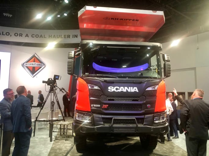 A Scania XT “tipper” truck, like this one on display in Navistar’s booth, may one day find work hauling from mines in Canada.