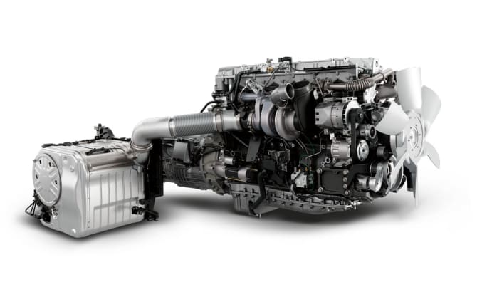 The aftertreatment system uses a dual-dose SCR to remove NOx emissions, as well as a diesel particulate filter.