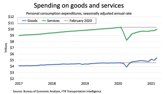For the “glass half empty” crowd, sharply stronger spending on services sounds like a threat to freight volume. After all, if the substitution of goods for services helped spur freight volume, wouldn’t a reversal of that trend lead to weaker freight volume?