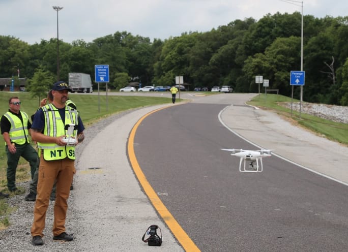 A drone operator launches a drone to survey the fatal crash section of the ramp.