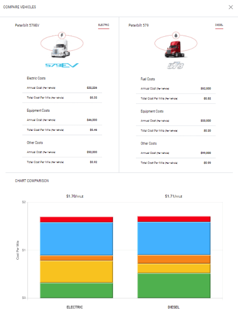 The operating cost calculator allows prospective customers to evaluate the total cost of ownership of a Peterbilt Model 220EV, 520EVor 579EV on a per-mile (on-highway applications) or per-hour basis (vocational applications).