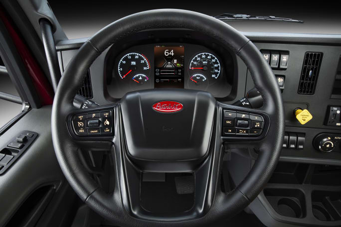 The trucks feature an all-new instrument cluster, featuring an analog speedo and tachometer with a high-resolution, seven-inch digital display which relays key information. Drivers are able to toggle through menu cards on the digital display utilizing the new multi-function steering wheel and the display navigation knob. The digital display is deeply integrated into the electronics of the truck with key information like system check, trip summary, power take-off functions, advanced driver-assistance systems and tire pressure monitoring systems all displayed through the menu cards.