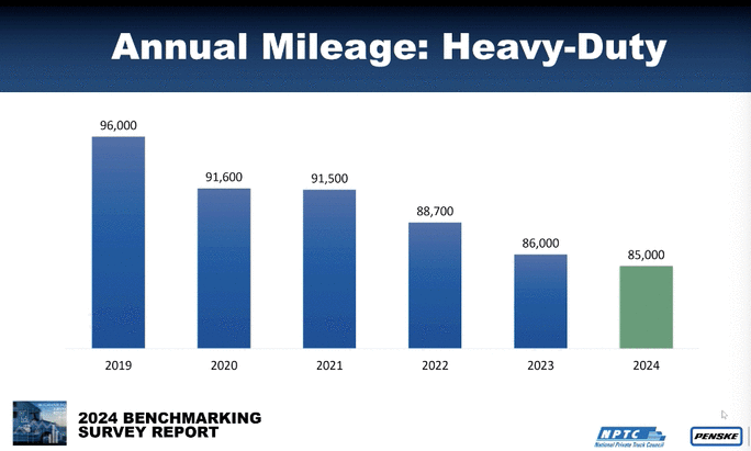 As private fleets more closer to the customers, he said, the average annual mileage per truck among the private fleets in the survey has fallen from 96,000 in the 2019 survey to 85,000 this year.