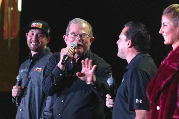 Rusty Rush jokes with former NASCAR driver Tony Stewart during the awards ceremony.