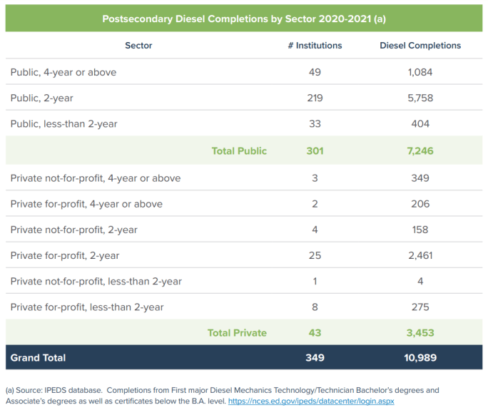 Public, two-year schools and private, for-profit two-year schools graduate the highest number of students in the diesel sector.