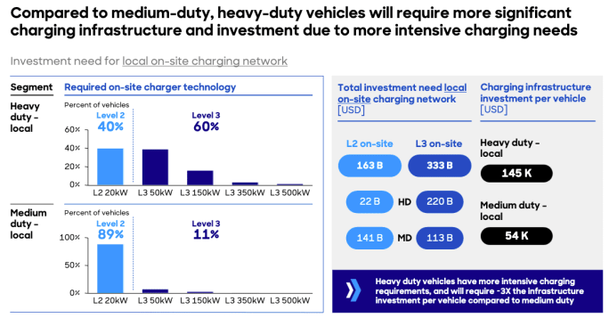 Heavy-duty electric vehicles have more intensive charging requirements and will require three times the infrastructure investment per vehicle compared to medium duty.