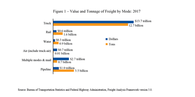 Trucks remain the most commonly used mode to move freight, transporting 64% of the weight (12.7 billion tons) and 72% of the value ($13.7 trillion) in 2017.
