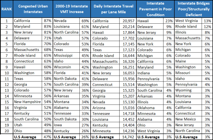 The chart ranks states whose Interstate systems are the most congested, have experienced the greatest increase in vehicle miles of travel (VMT) since 2000, are busiest (based on daily travel per lane mile), have the largest share of pavement in poor condition, and have the greatest share of bridges in poor/structurally deficient condition.