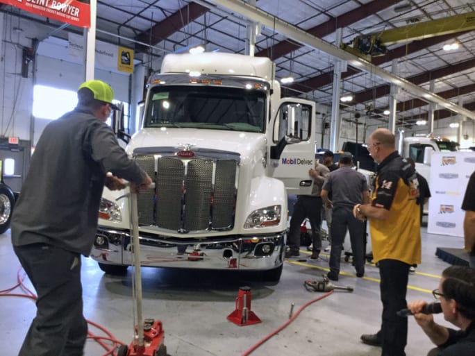 With students, customers and other onlookers cheering them on, the two five-man teams scrambled over two Peterbilt Model 579 tractors in a neck-and-neck race to take top technician honors for the day.
