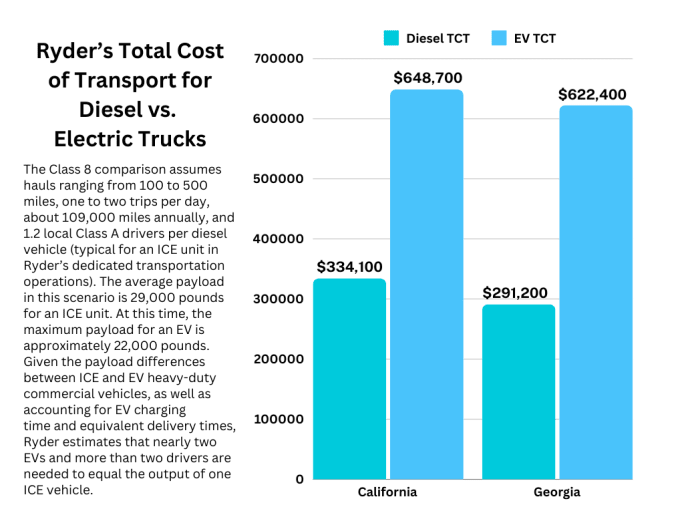 Sanchez said the purpose of Ryder’s analysis is to quantify the current gap in cost between diesel and EVS and to identify the cost drivers.