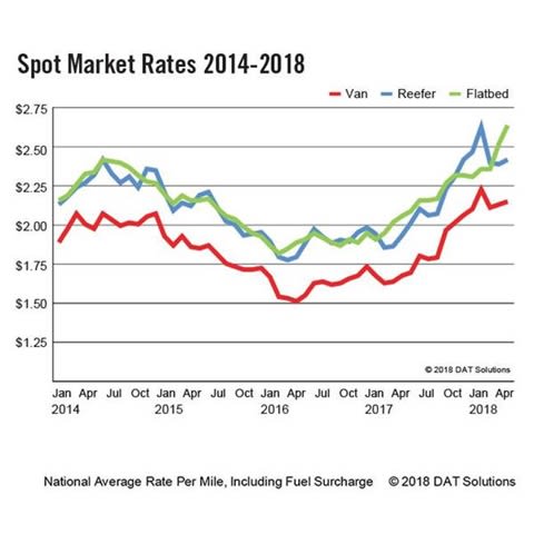 Spot market rates achieved record highs in April for semi-trucks equipped with flatbed trailers, rising 78 cents per mile compared to April 2017. Rates for dry van and refrigerated van cargo rose 49 cents, year-over-year. Graphic: DAT Solutions