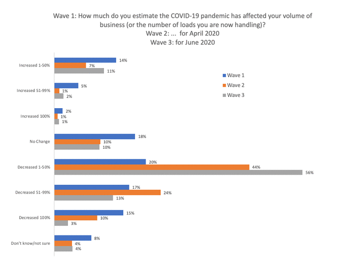 A serious effect of the pandemic for most fleets has been an unprecedented drop in business – but that has varied greatly, depending on the type of freight hauled. In fact, in the first weeks, fleets that carried in-demand goods such as toilet paper, bottled water, and groceries, were in high demand. You can see that reflected in our survey; in the first wave, 21% of respondents saw their business increase, but only 9% did in the second wave, which asked about business levels in April. In the most recent survey that had risen to 14% of respondents reporting an increase in business in May.