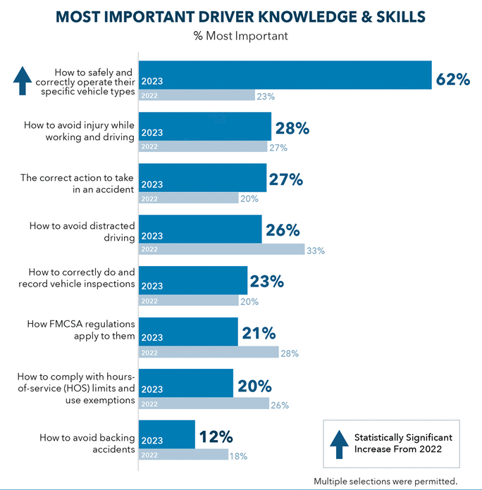 Safely and correctly operating a specific vehicle type topped the list with 62% of respondents agreeing it was the most important driver knowledge and skill — a 39% increase over 2022, when distracted driving was the top of the list.
