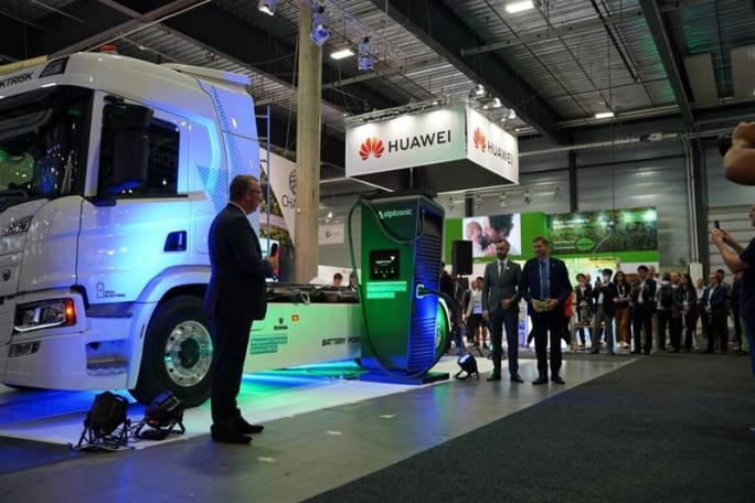 The Megawatt Charging System was demonstrated on an Alpitronic charger and a Scania electric truck.