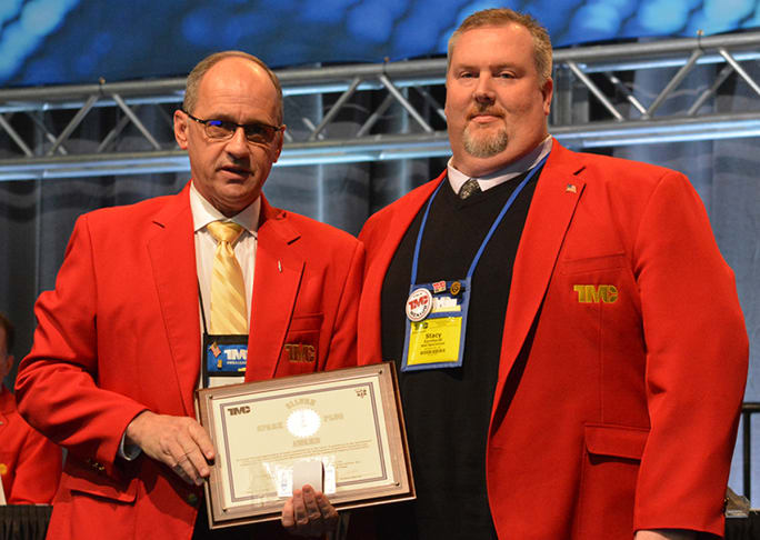 Peter Savage, director of quality and implementations at Clarke Power Services, accepts his award from TMC Chairman Ken Calhoun.