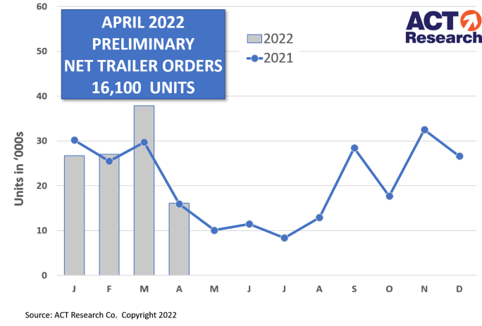 Trailer orders in April were down substantially from March, although up slightly over a year ago, as lockdowns in China and the war in Ukraine prompted caution in the market.