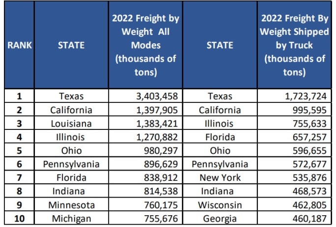 The TRIP report also noted the amount of freight shipped to or from sites in each state, by all modes and by trucks. The top 10 states for shipping by truck, when measured by value, are: