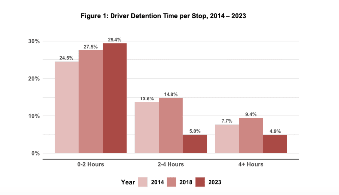 In 2023, drivers reported being detained in 39% of all stops. In 9.9% of stops – one in every 10 – drivers experienced more than two hours of detention.